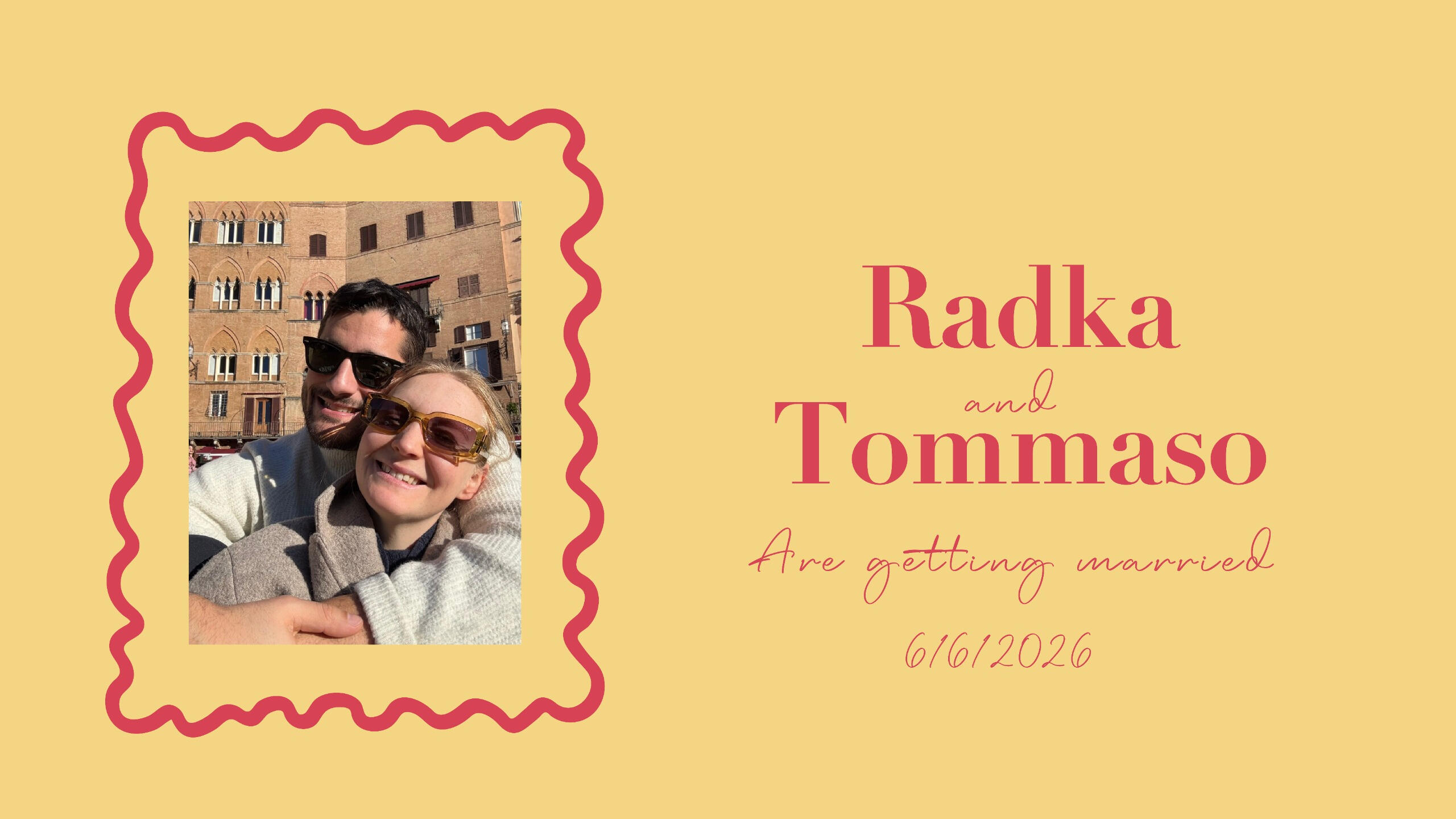 Non sentiamo il bisogno di regali materiali, perché abbiamo già tutto ciò che ci serve.Se desiderate farci un pensiero, stiamo organizzando un viaggio speciale dopo il matrimonio.